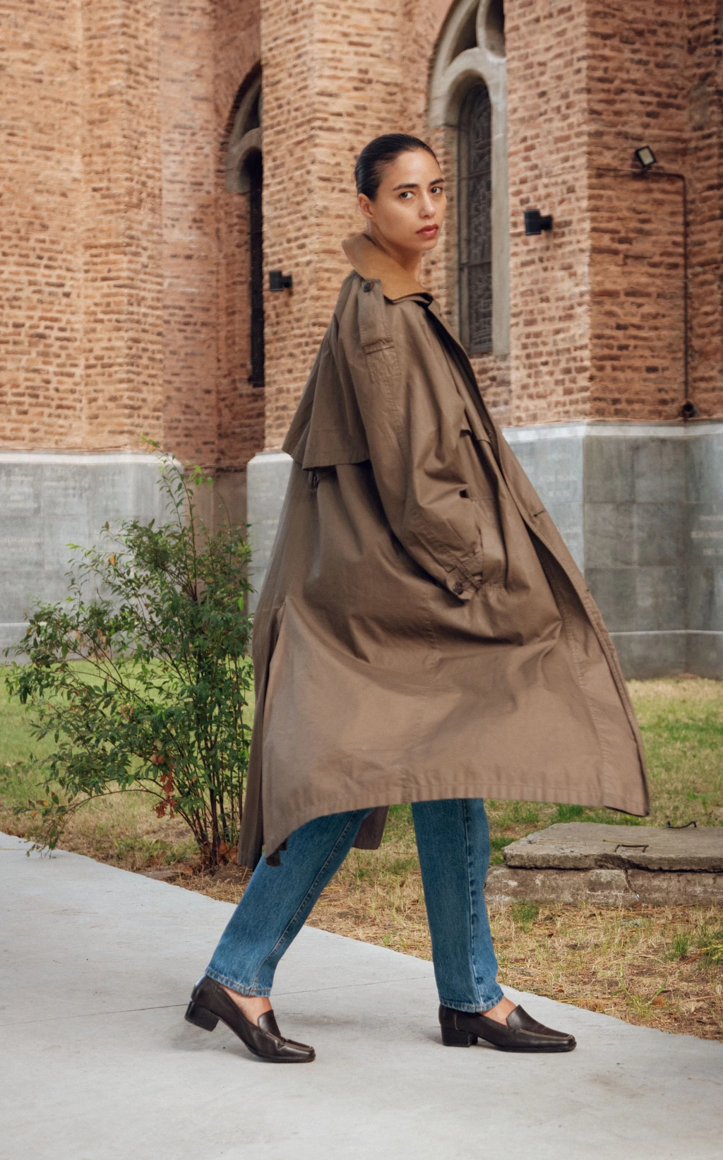 Loafers de cuero color marrón con taco bajo de madera para todos los dias, estilo minimal.