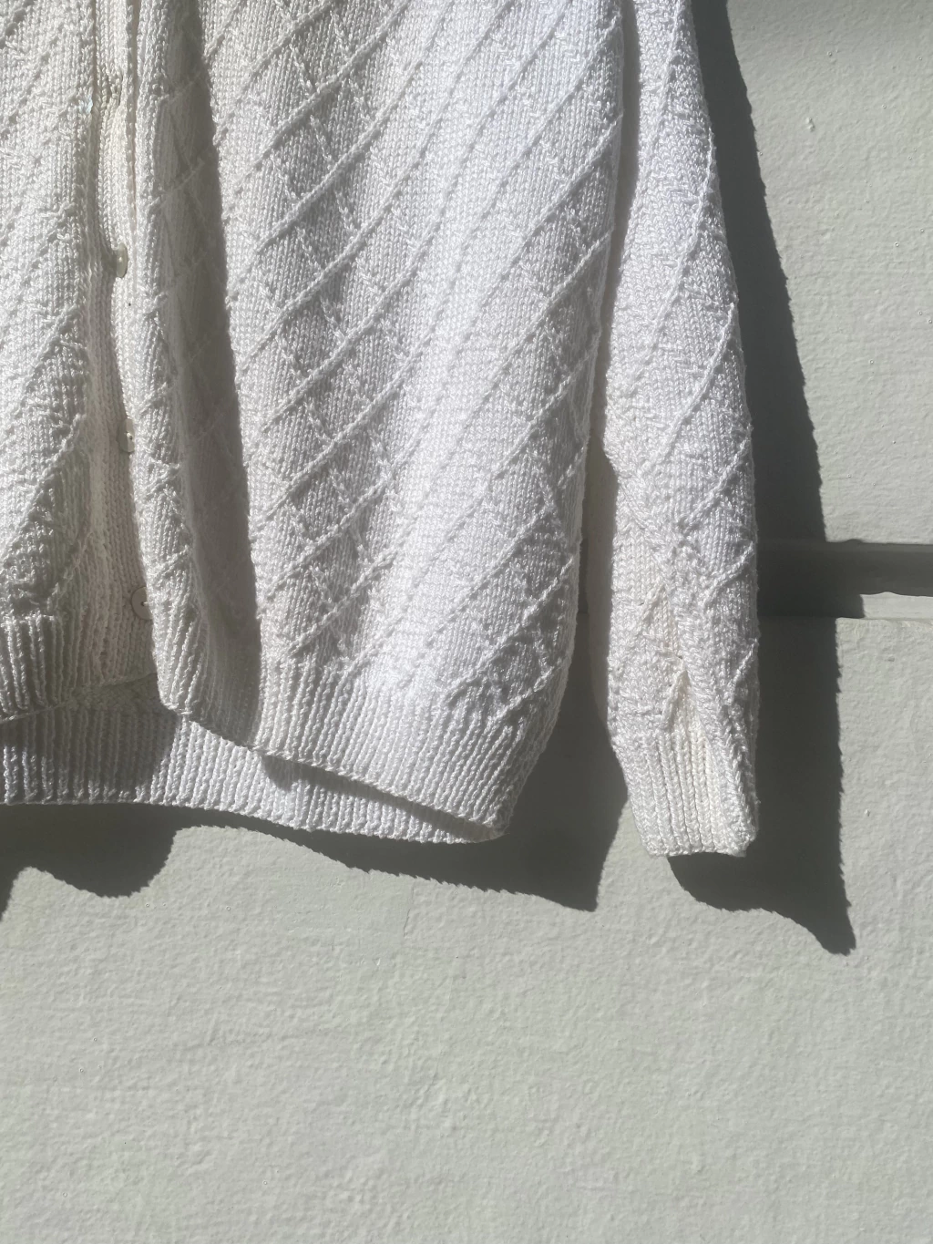 Cárdigan tejido en color blanco / tiza grueso, con botones originales mother of pearls. Estilo clásico minimal, de silueta holgada. Optimo estado de conservación.